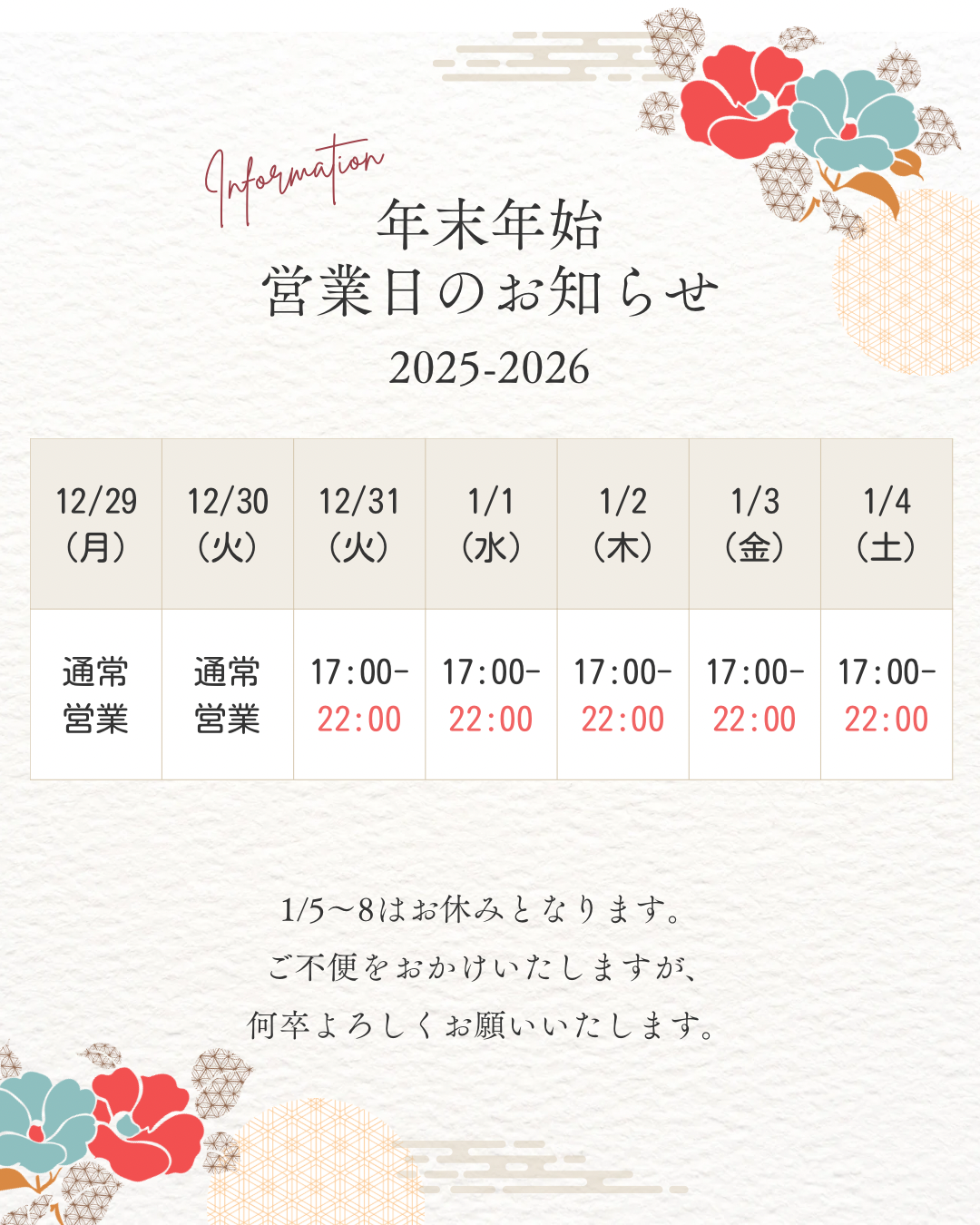 ※31日〜4日は22時まで(ラストオーダーラストオーダー21:30)となります。